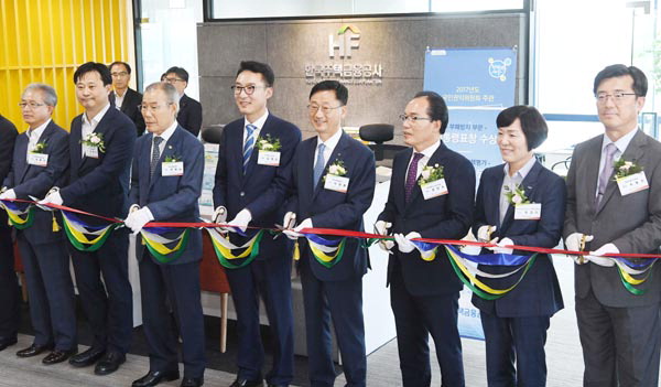 19일 오후 부산 사상구 괘법동 송원센터빌딩 9층 한국주택금융공사 서부산지사 개소식에 참석한 주택금융공사 이정환(오른쪽 네 번째) 사장, 김대근(오른쪽 다섯 번째) 사상구청장 등 내빈들이 축하 테이프를 자르고 있다.