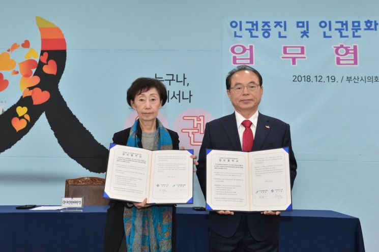 오거돈 부산시장과 최영애 국가인권위원회 위원장은 19일 오전 11시 30분 부산시의회 대회의실에서 인권증진과 인권문화 확산을 위한 업무협약을 체결했다.